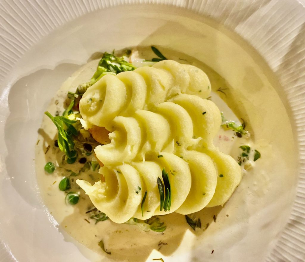The evening’s menu followed a reassuringly concise formula: three starters, five mains, including a vegetarian option. My gluten-free request was acknowledged without difficulty although I had mentioned it on booking but the restaurant were unaware. I ordered cod to start, followed by fish pie, and added the optional velouté.